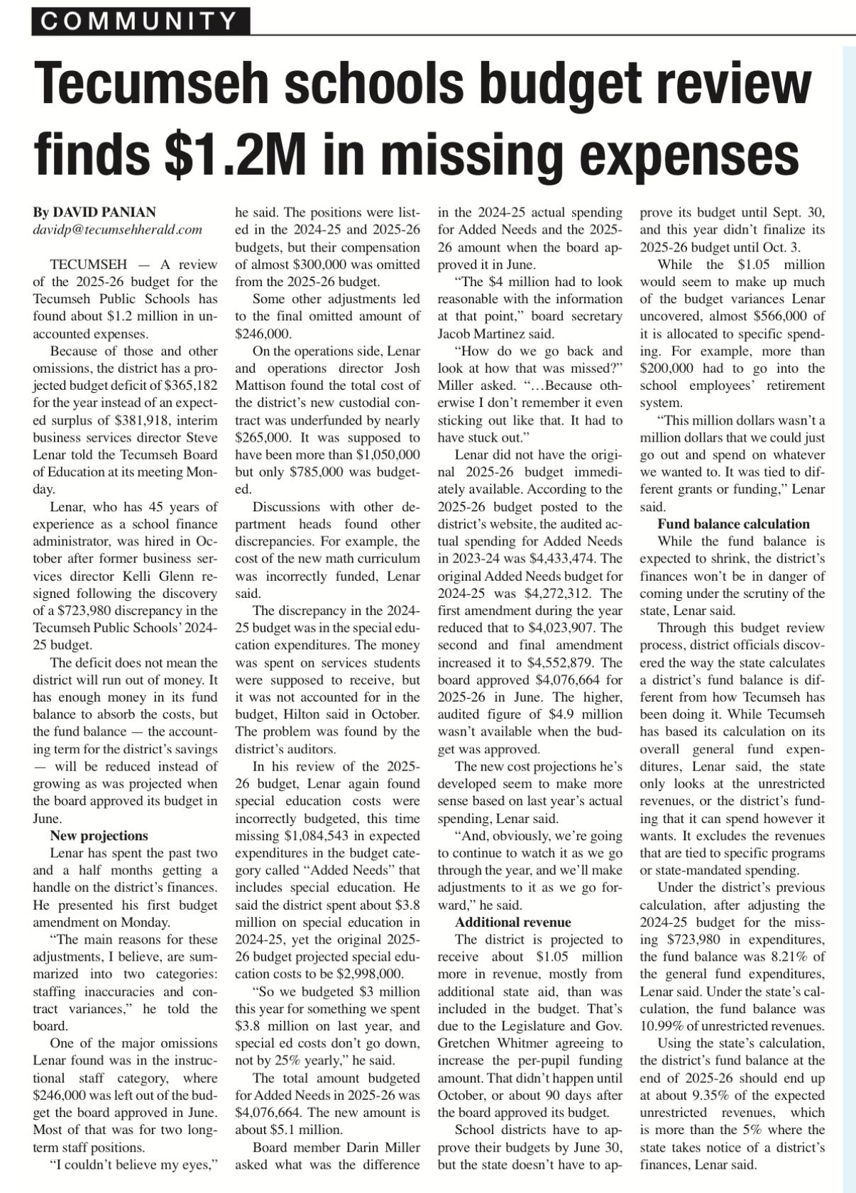 Ignoring for the moment Mary’s belief that the Herald is a free publication, is she suggesting that the Herald is an extension of Tecumseh Public Schools? It has been rumored before, but never confirmed. I am joking, of course. David Panian is an excellent journalist and not at all affiliated with the district. Still, why does she mention “increasing transparency” as though the district should take credit for his work?