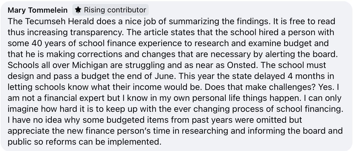 Mary then goes on to say that schools all over Michigan are struggling. She’s partially right, some of our neighboring districts are struggling with enrollment. Unfortunately, TPS is the only district continually causing our own struggles. Bungling the budget was an unforced error that other districts aren’t dealing with. Once again, it’s just Tecumseh.