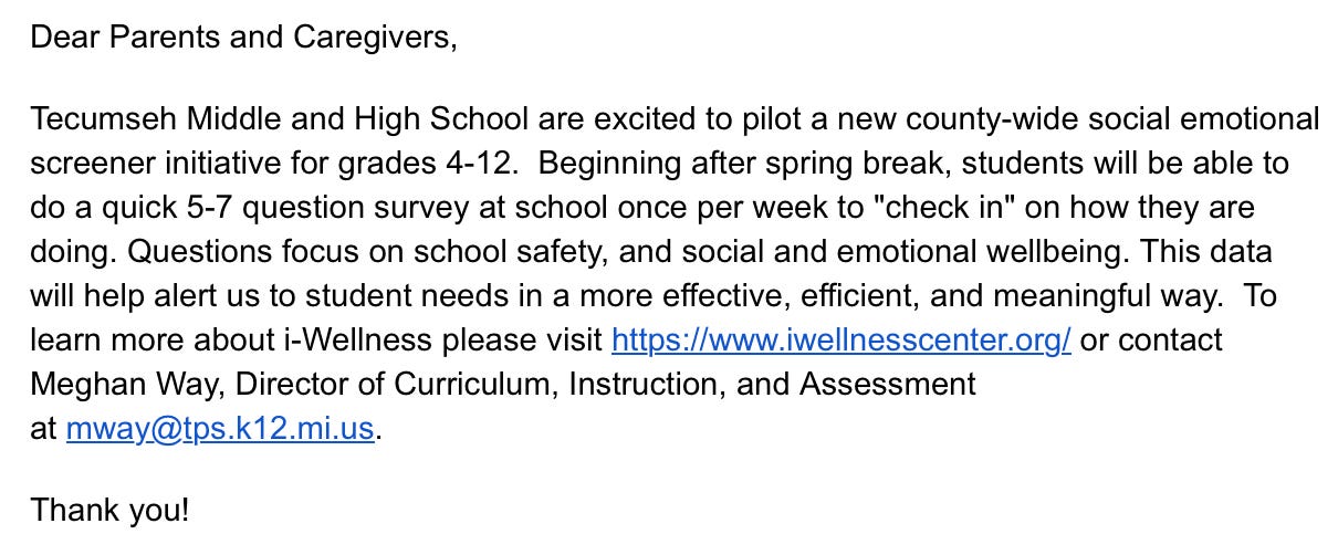 My next two articles will be on Social / Emotional Learning (SEL). While I have many thoughts (good and bad) on the concept as a whole, the program we are “piloting” (the one you received an email about last Friday), is concerning to say the least. So concerning, in fact, that another journalist is already slated to publish an article on it. My upcoming article will focus on concerns over the iWellness program from a psychological perspective only, and will be published in tandem with the other journalist’s piece.