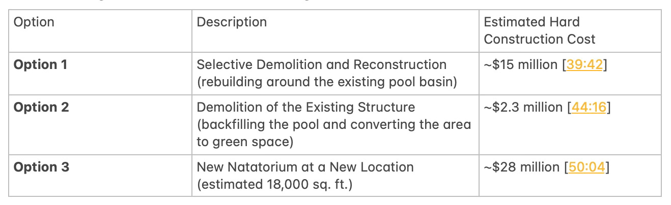 The administration presented three high-level concept options for the community pool after a structural report indicated the current building should remain closed due to degradation: