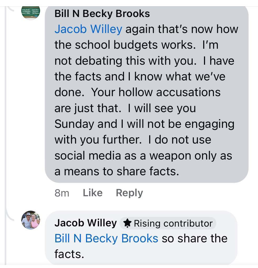 Folks may have noticed that I pick on Becky Brooks quite often. There are many reasons for this, but the screenshot below is one. Her “I have the facts” statement is what inspired this blog. Turns out, the facts were all public record, so I started EducateTecumseh to share the facts.