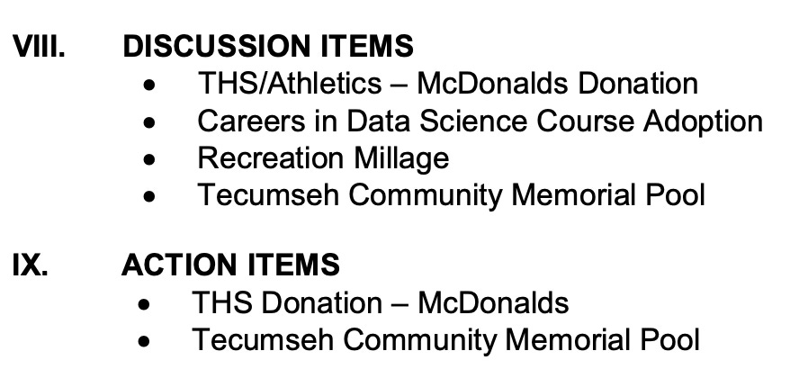 Under Discussion Items, the board will discuss the Tecumseh Community Memorial Pool and a recreation millage. The pool is also listed as an action item for the Monday meeting.