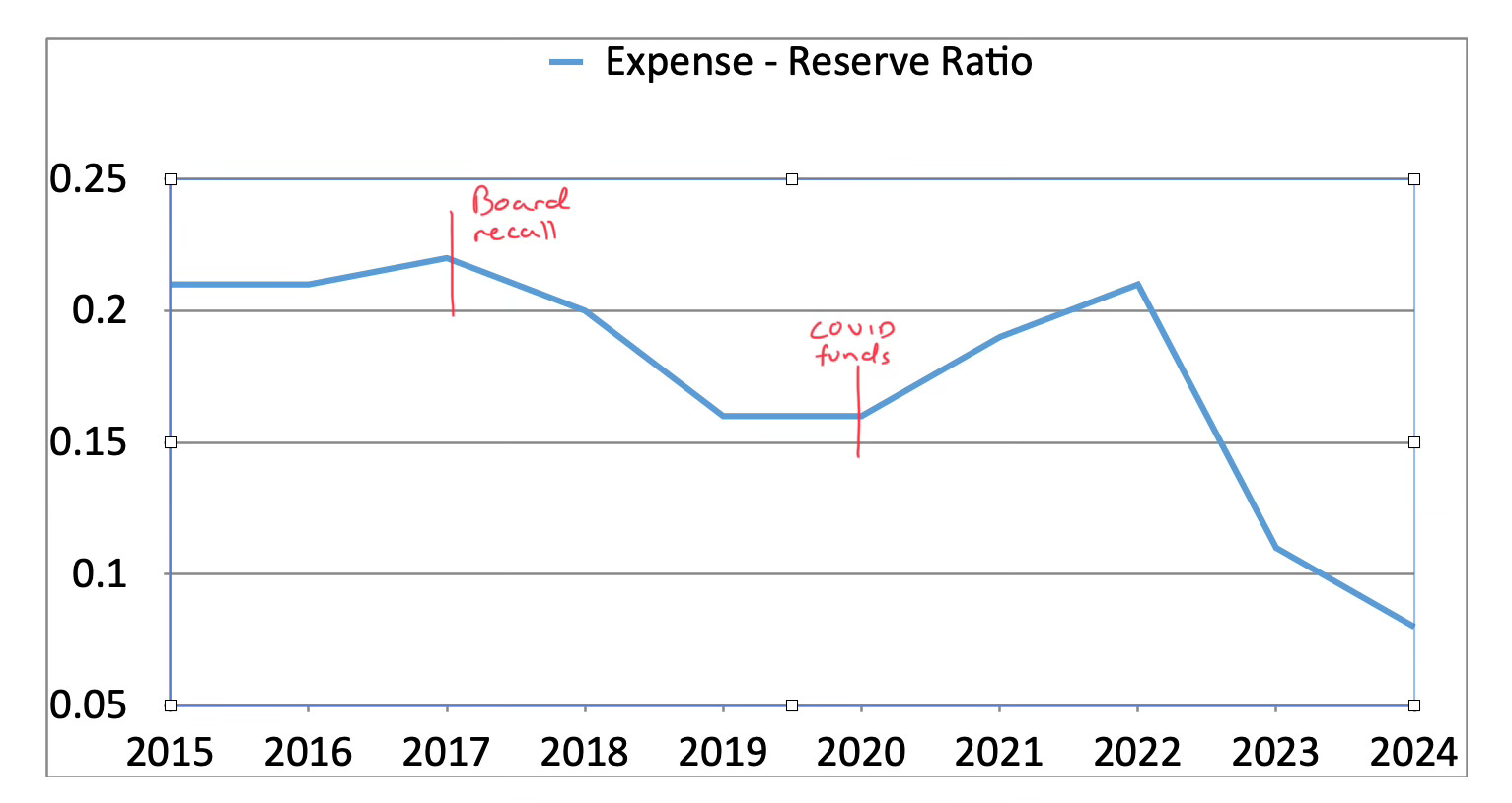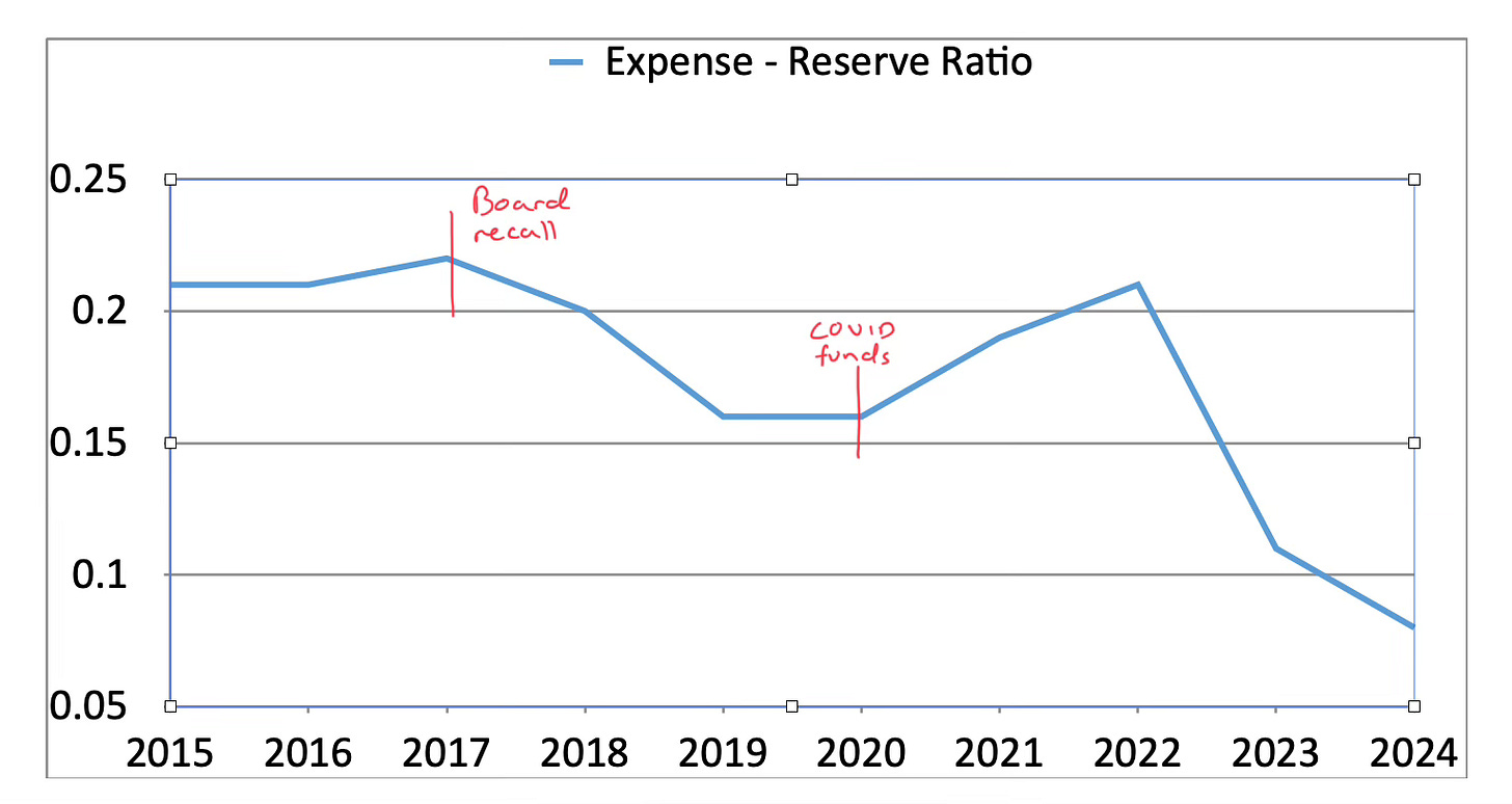 The chart above shows the TPS equity fund for the last decade. The line shows a similar pattern to what I reported previously for other metrics (https://open.substack.com/pub/educatetecumseh/p/tps-finances-trends-over-a-decade?r=c5fgx&utm_medium=ios), but there may be hope for the decline as funding for building renovations could cushion our reserves. This ratio represents all expenditures, from teacher salary to roof repair. Ceteris peribus, a surprise HVAC repair, for instance, would cause a sudden dip.