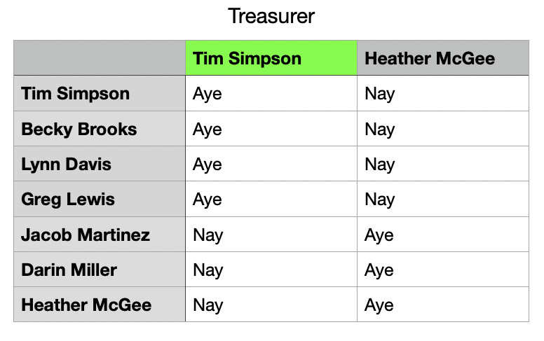 Next, Tim Simpson was nominated for treasurer, followed by a nomination for Heather McGee. This time, the three newest members (Martinez, McGee, and Miller) voted for McGee, but were outvoted by the four longest serving members (Davis, Brooks, Simpson, and Lewis) in favor of Simpson.