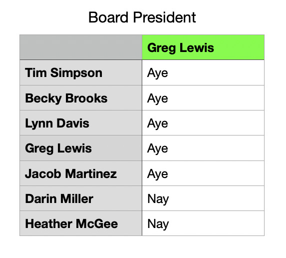 With the retirement of board president Tony Rebottaro, a new president had to be nominated. The nomination process began even before we stood to say the pledge of allegiance. Becky Brooks quickly leaned into the mic, nominating Greg Lewis. New board members Darin Miller and Heather McGee promptly voted against Lewis, only to be outvoted by the incumbents (Simpson, Brooks, Martinez, Davis, Lewis).