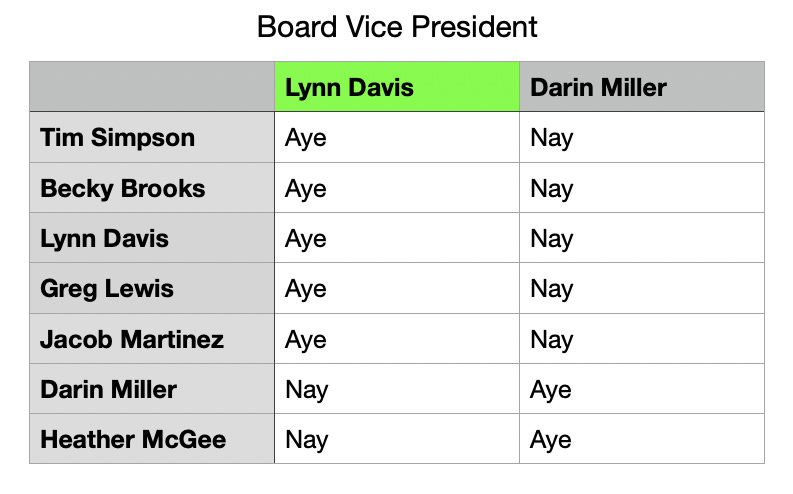 Greg Lewis, now board president, then began sourcing nominations for vice-president of the board. Lynn Davis and Darin Miller were nominated, so Lewis put it to a vote. Once again, the vote went along lines of incumbency, with incumbents voting in favor of Lewis, and new members voting in favor of Miller.